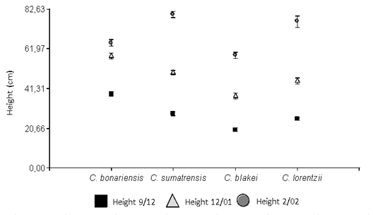 Figure 2: Height (cm) of Conyza lorentzii, C. blakei, C. bonariensis and C. sumatrensis on different sampling dates. Equal letters indicate non-significant differences according to the lsd test (α= 0.05). Vertical bars represent the standard error of the mean.