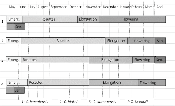 Observations were made on each population every 2/3 weeks to record the beginning of the different phenological stages (emergence-rosette stage-elongation-flowering-senescence), which were established when half of the plants analyzed reached this stage.