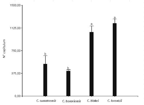 Figure 4: No. of capitulums of Conyza bonariensis, C. sumatrensis, C. blakei and C. lorentzii (equal letters indicate non-significant differences according to the lsd test (α= 0.05)). Vertical bars represent the standard error of the mean.
