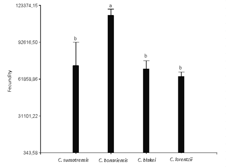 Figure 6: Fecundity of Conyza sumatrensis, C. bonariensis, C. blakei and C. lorentzii (equal letters indicate non-significant differences according to the lsd test (α= 0.05)). Vertical bars represent the standard error of the mean.