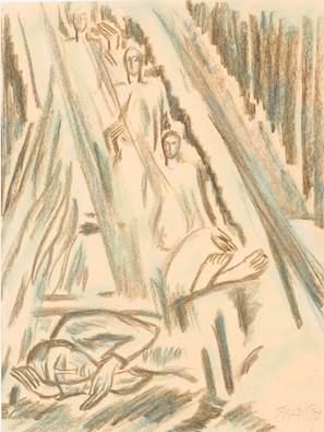 En particular, existe una llamativa repetición de dibujos y pasteles con motivos religiosos en las obras que integran la colección del Museo Agustín Araújo, como los trabajos que representan escenas bíblicas tales como la escalera de Job (Génesis, 28:10)(Imagen 7), Yael matando a Sísara (Jueces, 4:21) o lo que podría ser el pasaje del levita y su concubina (Jueces, 19:21). Estas obras se caracterizan por su fuerte grafismo y tenor apocalíptico, similar al que adquirieron muchos expresionistas europeos como consecuencia de los impactos de guerra. En este sentido, al igual que con la representación del paisaje paraguayo, Witte mantiene una mirada extranjera, más preocupada por comprender el horror de los acontecimientos en términos espirituales que por retratar la temática religiosa con relación a problemáticas específicas de carácter local, tales como el sincretismo religioso y los procesos de secularización de la cultura.59