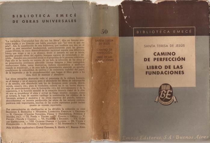 La «Nota preliminar» del libro Camino de Perfección - Libro de las Fundaciones, de Santa Teresa de Jesús1, fue una gran sorpresa, no conocía su existencia. Llegué al material trabajando la bibliografía. Me pregunté: ¿no habrá escrito mi padre algo más para Emecé? Y así fue como descubrí este material, rastreando en diferentes bibliotecas. Recordemos que en esos años Leopoldo Marechal había publicado en esta misma editorial Emecé varias obras: la traducción directa de la obra en francés La Duchesse de Langeais2, de Honorato de Balzac (1943); Santa Rosa de Lima3, (1943); «Prólogo» a De la consolación por la filosofía, de Boecio4, Traducción de Esteban M. Villegas (1944), «Prólogo» a Vidas, opiniones y sentencias de los filósofos más Ilustres de Diógenes Laercio5, Tomo I (1945) y El viaje de la primavera6 (1945).