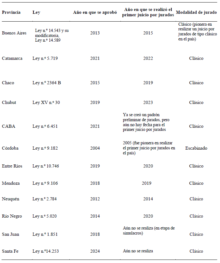 Actualmente la institución del juicio por jurados en la República Argentina no se encuentra reglamentada a nivel nacional, a pesar de constituir un mandato constitucional primigenio, consagrado por los convencionales constituyentes originarios, en el art. 24 de la Constitución Nacional (en adelante CN) de 1853 y de poseer plena vigencia, puesto que no ha sido derogada por la última reforma constitucional de 1994. No obstante, el dilatado incumplimiento perpetrado por el Congreso de la Nación -ya que es a este órgano a quien la CN le otorgó la exclusiva atribución de dictar leyes generales para el establecimiento del juicio por jurados a nivel federal, conforme lo dicta su actual art. 75, inc. 12, in fine-, a partir del siglo XXI, un conjunto de provincias, cuyo número aumenta año tras año, ha ido sancionando e implementando el juicio por jurados en sus respectivas jurisdicciones. Esta prerrogativa de las provincias, consistente en dictar sus propias leyes procesales, es decir, legislación de forma y no de fondo, es una competencia no delegada por los Estados provinciales al Gobierno Federal, conforme lo dispuesto por los arts. 121, 122, 123 y 126 de la CN. La implementación del juicio por jurados, a nivel provincial, es progresiva. El grupo de provincias que ha instaurado el juicio por jurados, en orden cronológico, es el siguiente (ver Anexo A, Tabla A1):