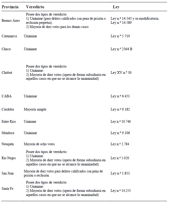 El perjuicio al principio de igualdad se materializaría al producirse una coyuntura de desigualdad procesal, la cual surge de un análisis comparativo entre la normativa neuquina y otras jurisdicciones del país (ver Tabla A2), en concreto, la defensa de Canales citó la Ley n.o 14.543 de juicio por jurados de la provincia de Buenos Aires, que exige unanimidad de votos afirmativos para que se dicte un veredicto de culpabilidad cuando se trate de delitos que contemplen penas de prisión o reclusión perpetua. De esta manera, los imputados sometidos a procesos penales, dentro de una jurisdicción provincial que prevé un juicio por jurados, cuyo veredicto se encuentre convalidado por mayoría se hallarían en una posición desigual, de evidente desventaja, respecto de aquellos que son juzgados en provincias cuyos códigos procesales penales exigen la unanimidad en el veredicto de culpabilidad del jurado. La CSJN refutó la objeción constitucional aducida por la parte recurrente al considerar que no existe, dentro del contenido de la CN, una disposición que exija una determinada cifra de votos para confirmar la culpabilidad o inocencia de un imputado por parte de un jurado popular (CSJN, 2019, fallos: 342:697, cdo. 17.°, 2.º párr.). Por tanto, la validez de una legislación provincial, que regule el juicio por jurados, no se halla supeditada al cumplimiento de una cláusula constitucional taxativa que la obligue a instaurar un veredicto unánime. De modo que, para la CSJN, las legislaturas provinciales cuentan con plena potestad para fijar el tipo de mayoría, o unanimidad, que consideren adecuado para legitimar el veredicto de sus jurados sin que ello conculque la CN. Decidir lo contrario, para la CSJN, supondría revocar el federalismo (CSJN, cdo. 18°, 5.º párr.).