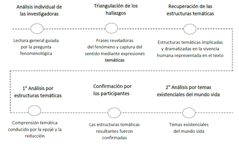 Este proceso comenzó con la lectura general de las entrevistas por cada una de las investigadoras, por separado, guiadas por la pregunta fenomenológica de la investigación.