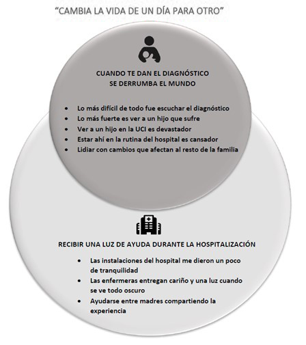 La Figura 2 reúne a la estructura principal de los resultados y se titula “cambia la vida de un día para otro”. Está formado por 2 estructuras secundarias: “cuando te dan el diagnóstico se derrumba el mundo” y “recibir una luz de ayuda durante la hospitalización”. La primera estructura reúne las difíciles experiencias que viven madres y padres al cuidado de su hijo/a durante la hospitalización; estos significados están agrupados en 5 subestructuras temáticas que narran momentos complejos tales como “lo más difícil de todo fue escuchar el diagnóstico”, “lo más fuerte es ver a un hijo que sufre”, “ver a un hijo en la UCI es devastador”. También esta estructura contiene el impacto personal de la hospitalización en la subestructura “estar ahí con la rutina del hospital es cansador” y el impacto familiar que provoca la hospitalización expresada como “lidiar con cambios que afectan al resto de la familia”. La segunda estructura está posicionada detrás y en contacto con la primera ya que se observó como un elemento que apareció simultáneamente a los difíciles momentos narrados por los participantes y se titula “recibir una luz de ayuda durante la hospitalización”. Esta contiene 3 subestructuras que fueron “las instalaciones del hospital me dieron tranquilidad”, “las enfermeras entregan cariño y una luz cuando se ve todo oscuro” y “ayudarse entre madres compartiendo la experiencia”.