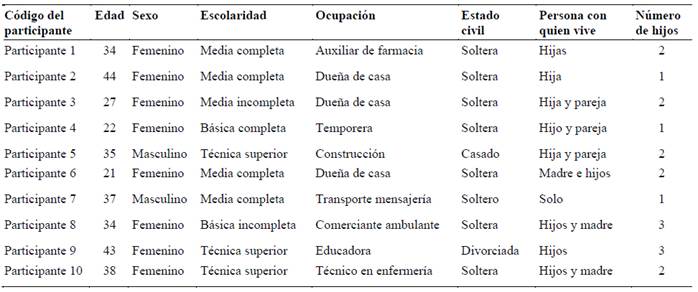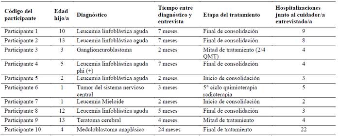 Paralelamente a la entrevista se aplicó un cuestionario sociodemográfico para la caracterización de los participantes en el que se registró edad, sexo, nacionalidad, escolaridad, ocupación, región de residencia, ocupación, previsión de salud, estado civil y número de hijos. En el cuestionario se le preguntó también información del hijo, como su edad y diagnóstico, así como el tiempo desde el diagnóstico a la entrevista, la etapa del tratamiento y el número de hospitalizaciones en que la persona entrevistada realizó la labor principal de cuidado.