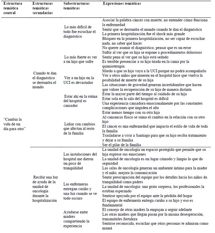 El relato de la experiencia vivida por madres y padres durante la hospitalización de su hijo/a en una unidad de oncología fue analizado dando origen a las estructuras temáticas cuyos resultados se resumen en la Tabla 3.