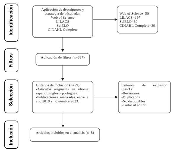 Diseño: La revisión sistemática abarcó los últimos 5 años (2019-2023) y tuvo como objetivo resumir la literatura existente, ya sea teórica o empírica, con la intención de proporcionar una mayor comprensión al tema dado. Se utilizaron las bases de datos Web of Science, Literatura Latinoamericana y Caribeña en Ciencias de la Salud (LILACS), Scientific Electronic Library Online (SciELO) y Cumulative Index of Nursing and Allied Literature (CINALH) Complete.