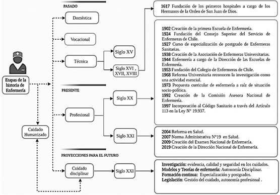 En el caso de Chile, la enfermería ha sido reconocida por su rol fundamental en la gestión del cuidado desde 2007, otorgándole autonomía profesional y responsabilidad. 11 Se destaca que, en cada etapa histórica de la enfermería, han ocurrido hitos marcados por profundas experiencias de crecimiento, desarrollo de conocimientos y herramientas, que han enriquecido la profesión para consolidarse como única y necesaria para la sociedad, la cual en Chile se inicia a comienzos del siglo XX.