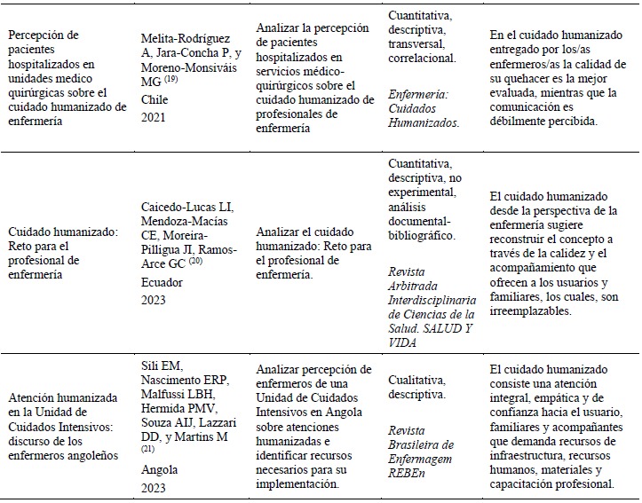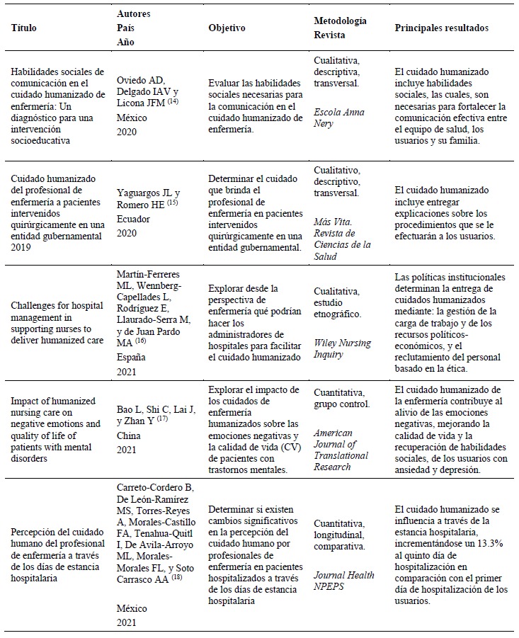 La Tabla 1 T2 detalla información general de los 8 artículos seleccionados, los cuales se estructuraron de acuerdo con el título, autores, país, objetivo, metodología, revista y principales resultados de acuerdo a la pregunta de interés científico. Uno de los estudios realizó intervención para evaluar el impacto del cuidado humanizado y el resto fueron de tipo no experimental ya sea exploratorios, descriptivos, comparativos o correlacionales. Otras características de los estudios se describen en la tabla.