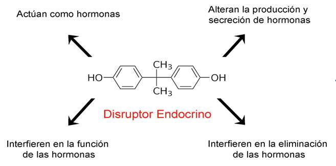Muchas de estas sustancias químicas se comportan como hormonas, alteran la homeostasis del sistema endocrino provocando un desequilibrio en el balance de estrógenos, andrógenos y hormonas tiroideas. Estos compuestos persistentes en las cadenas tróficas y bioacumulables se conocen como alteradores o disruptores endocrinos (DE) (Figura 1) 6.