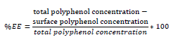The systems encapsulation efficiency to encapsulate bioactive compounds was determined by the Folin-Ciocalteau method (described in Section 2.6), by determining the polyphenol content in the whole sample and in the surface of the microcapsules. The content of phenolic compounds on the surface of the nano-microcapsules and the content of free phenolic compounds after destabilization and rupture of the nano-microcapsules were determined.