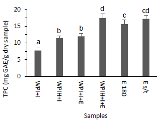 Total polyphenol content was determined in the powder samples (Figure 2). As can be seen, there were no great differences in TPC values between the extract subjected to temperature (E 180) and the extract without temperature (E s/t). This may suggest the temperature of the air at the spray dryer (180°C) would not seem to greatly affect the content of the polyphenols present in the extract in the time of exposure (residence time in the order of seconds)32. Moreover, TPC increased after the addition of the extract in both encapsulating systems, which is why it can be confirmed that the extract obtained from the winemaking byproduct represents a contribution in the content of polyphenols.