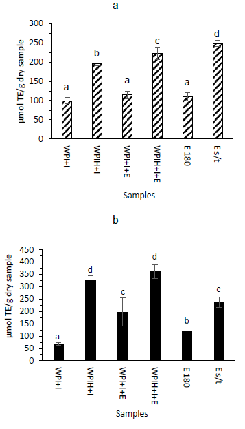 In Figure 3, the results of the antioxidant capacity measured by ORAC-FL (Figure 3a) and ABTS (Figure 3b) of the different powder samples are shown. The same trend was seen in both assays, showing that systems containing hydrolyzed whey protein (WPIH), both with extract and without extract, have greater antioxidant capacity compared to systems containing non-hydrolyzed protein (WPI). The highest antioxidant capacity in systems with protein hydrolysate was due to the release of bioactive peptides with antioxidant capacity, that are encrypted in the native protein, during the hydrolysis of the protein34)(35.