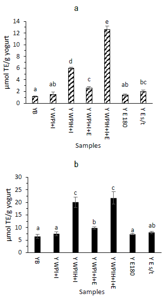Figure 4: Antioxidant capacity of yogurt formulations by ORAC-FL (a) and ABTS (b). Bars denote the mean values and error bars the standard deviation. Different letters represent significant differences according to Tukey test (p < 0.05)