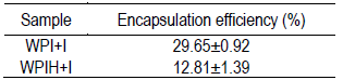 The presence of TPC values in systems without the addition of phenolic compounds (WPI+I and WPIH+I) is due to the fact that the -OH groups present in the proteins that are part of the encapsulating systems are capable of reducing the Folin reagent33. Likewise, it is proposed as a good method to compare total polyphenol content of different samples due to the speed of the test.