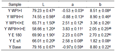As to parameter "b", large differences were seen between the samples with and without the incorporation of extract. The formulations of the control yogurts (Y WPI+I, Y WPIH+I and Y Base formulation) presented positive and higher values without significant differences between them (p>0.05), indicating a tendency towards more yellow while the yogurts with the presence of both encapsulated and non-encapsulated extract presented lower “b” values (Y E s/t presented the lowest value without significant differences with Y WPIH+I+E, p>0.05), indicating that they present a color closer to blue.