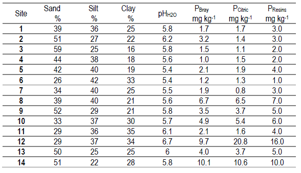 Table 1: Percentage of sand, silt and clay, soil pH in water, and soil P test using Bray I, citric acid and cationic resins as extraction methods (PBray, PCitric and PResins) for the experimental sites at the beginning of this study