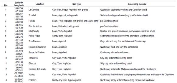 Pastures were established in 2008 by broadcast sowing after a chemical control of the native grassland. Due to a poor plant stand, the pastures had to be reestablished in the second year. The soil textures ranged from clay to sandy loam, and the soil pH ranged from 5.4 to 6.7. Sites with no history of fertilization and low levels of extractable soil P with natural grassland as their previous pasture were selected. Sites 12 and 14, however, did have some previous P inputs, with Bray I P of about 10 mg kg-1 compared with 1.0 to 6.7 mg kg-1 for other sites. Site 12 possibly received P via excreta due to temporal cattle concentration. Site 14 possibly had a history of fertilization associated with previous annual crop-pasture rotation.