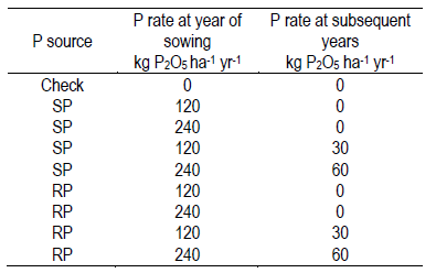 The trials had a randomized complete block design with four replications. Plot size was 10 m2 (2*5m). Broadcast application of triple superphosphate (SP, 0-46-0) and Algerian rock phosphate (RP, 0-29-0) were compared at different annual rates (Table 2). The RP was ground to a mesh of 100 mm and 10% P rendered soluble in a 2% citric acid solution.
