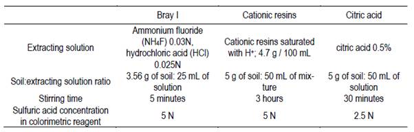The differences between the analytical methods are related to the nature of the extracting agent in each case and to the respective physicochemical mechanisms to remove or "solubilize” P from the soil matrix44)(45. The possible mechanisms are the following: the action of acid solvents, the substitution of the phosphate anion by other anions, the formation of compounds with polyvalent cations bound to P (Ca-P, Al-P, and Fe-P), and the hydrolysis of those cations bound to P44.