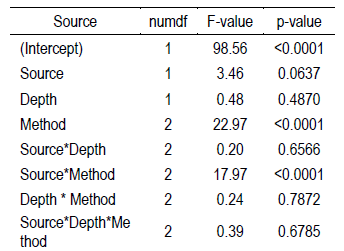 In the second step, a mixed model was applied, with site and species as random effects, while depth, method, source and their interactions were considered as fixed effects.
