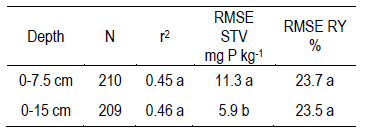 The RMSE STV was less with 0-15 cm compared with 0-7.5 cm soil samples (Table 6), but RMSE RY was not affected by sample depth.