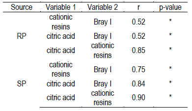 In the cationic resins method, the mechanism for solubilizing P operates by fixing cations (Fe, Al, Ca) to the cationic resins, with a similar result to that of compound formation. Additionally, as it is an exchange process, hydrogen ions (H+) are released, acidifying the medium, and adding the solvent action of acidity on a reactive fraction of calcium phosphates27)(50. Cationic resins and citric acid seem to have similar capacity to extract P-Ca, therefore evidencing a high correlation between them (Table 8) and slight differences in their relation with plant response (Table 7).