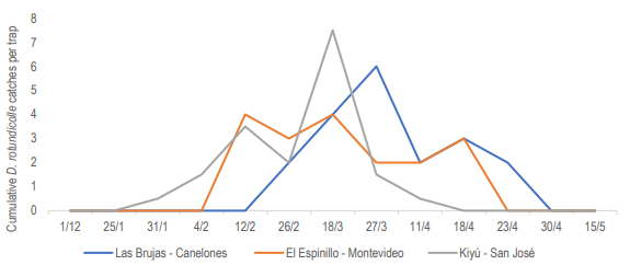 Within the framework of integrated pest management, monitoring of insect populations in space and time is remarkably important in order to make informed decisions on control measures9. The results of this study showed that light cross-vane traps proved an effective tool for monitoring D. rotundicolle adults. Flight was consistently observed between January and April in southern Uruguay conditions, with population peaks between mid and late February. Emergence from mesh-covered trees was observed in the same period as adult catches in light traps. This may be an alternative method to detect the adult emergence period, although it is a more disruptive and laborious methodology.