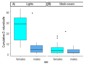 Figure 3: Comparison of females and males captured in light traps (A) and emergence from mesh-covered trees (B). Data are shown as boxplots and correspond to cumulative catches in all groves and seasons. Asterisks indicate significant differences (Chi-square test, P < 0,05)