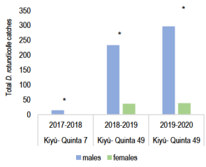 Figure 1: Diploschema rotundicolle flight period in Kiyú groves, throughout the four surveyed seasons (2015-2020). Arrows indicate oviposition damage observation dates. Total catches are not comparable since devices (meshes and light traps) evaluated per grove per season were not equivalent. Cumulative data is shown for better observation of the peak
