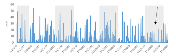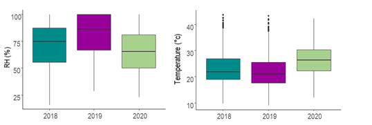 Oviposition damage was generally observed close or shortly after the peak of higher catches in light traps, between mid and late February. However, in the 2019-2020 season, oviposition damage was observed approximately one month after the usual recorded period. This season, also characterized by low trap catches, was particularly dry, which may have caused increased eggs desiccation or delayed oviposition. Slightly lower relative humidity and higher temperatures were also observed during this season compared to 2017-2018 and 2018-2019 summers (supplementary material Figures 1 and 2).