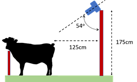 Based on the answers obtained, the best location of the camera was defined, being the best placement at a height of 175 cm and a distance of 125 cm from the cow, with an angle of 54°, as shown in Figure 1.