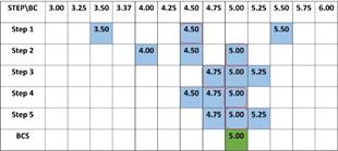 In the implementation, each blue box is an image from the database. At each step, the program selects 3 photos, one from each strip. In this way, the observer has the chance to reach any value within the whole range of BCS. In steps 1 and 2, images of cows with contrasting BCSs are shown, since the objective of these steps is to orient the user towards a narrower range. The database can be tuned for a specific herd of cattle. In the proposed example using intermediate-fat cows, in step 1 the bands are 3 to 4, 4 to 5 and 5 to 6. The photos shown to the user correspond to the midpoint of each band.