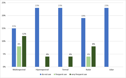 Regarding this matter, two questions of the survey -optional- explored aspects related to the use of remote sensing associated to commercialization of products and/or services based on images and/or data obtained by drones, UAVs, nanosatellites, satellites and/or planes, highlighting the sensor most frequently used. Approximately 35% of survey participants answered this question, as shown in Figure 3.