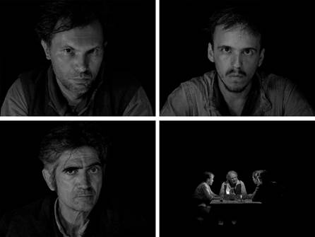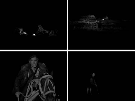 Existen varios aspectos de la materialidad estilizada de El movimiento que se destacan desde los primeros minutos: el blanco y negro de la imagen, el formato cuadrado -en 4:3- que reverbera hacia el pasado del cine, los primeros planos cerrados y enfocados casi exclusivamente en el rostro de los protagonistas. Esa última decisión adquiere un peso peculiar justo después de la escena inicial, cuando el filme comienza a transcurrir en medio de la noche. El Señor y sus seguidores, reunidos alrededor de una mesa para cenar junto a un campesino, parecen consumidos por una oscuridad espesa. La iluminación en la escena adelanta un método de registro constante: se extiende casi por completo sobre las personas, bañándolas en un aura fulgurante. Esa fuente de luz blanca permite apreciar por completo los detalles: las facciones de la piel curtida, las miradas de complicidad y horror que atraviesan la mesa, los movimientos tensos de los cuerpos a medida que avanza la velada y los comensales se entregan a la violencia. Pero el fondo, el espacio, por el contrario, se difumina. La luz no alcanza a tocarlos y, por lo tanto, se pierde la información; se borran los elementos descriptivos; desaparece la sensación de lugar físico. En tanto se exaltan las siluetas humanas, el entorno se vuelve casi imposible de dilucidar. ¿Dónde están esas criaturas de luz, que se ven como destellos flotando en un mar de oscuridad? A diferencia de una película como Jauja, donde el registro también era estetizado pero se componía sobre la materialidad de los paisajes patagónicos, el desierto pampeano de Naishtat atraviesa un filtro que desanda su apariencia concreta. Incluso en escenas posteriores, donde el Señor y su tropa atraviesan el llano, los juegos de luces y sombras siguen imponiendo su efecto, su forma particular de concebir la espacialidad. En un momento, el montaje genera cortes abruptos y muestra a cada uno de los hombres galopando por la noche, enfocándolos de frente y en medio de la nada. Lo único que llega a divisarse, además de sus cuerpos y el de sus caballos, son las siluetas grises y raídas de los árboles. Aunque esos detalles también adquieren una apariencia etérea: se mueven con los saltos del galope; pierden definición con el fuera de foco; quedan fragmentados por los encuadres cerrados. Es decir, asumen una forma abstracta, indeterminada, imprecisa. Figura 2