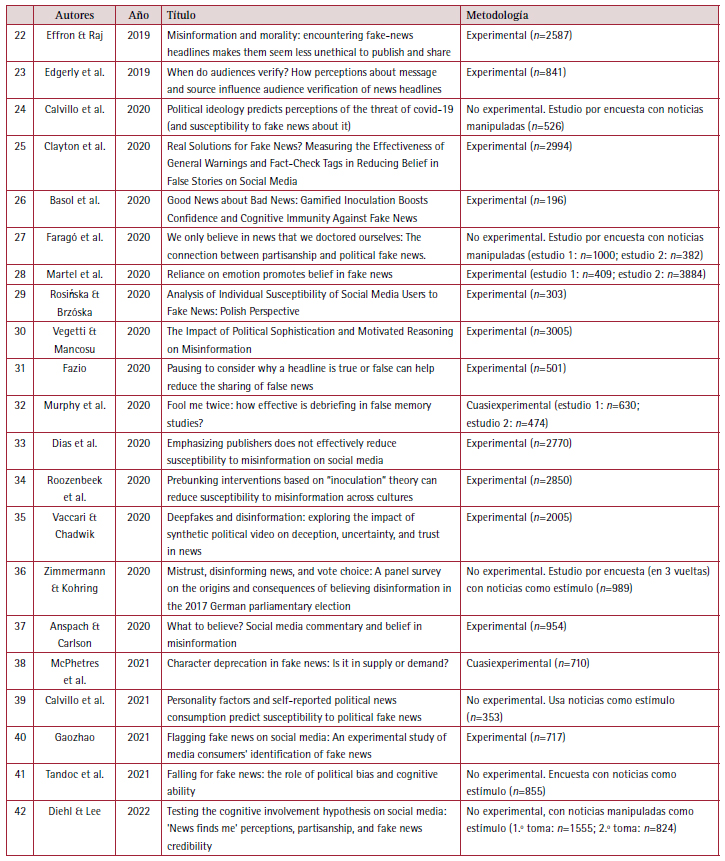 Se seleccionaron estudios experimentales y cuasiexperimentales que, si bien incluyen asimismo dentro de sus diseños múltiples herramientas de evaluación (encuestas presenciales, encuestas online, paneles, estudios longitudinales, etc.), enfocaron fake news como variable independiente. Se utilizaron versiones finales de los artículos (no preprints o en revisión), revisadas por pares y de circulación libre.