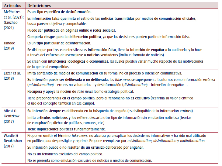 Dentro del corpus, se observa que el 69 % (29 artículos) trabajaron específicamente la definición de fake news políticas o incluyen su operacionalización. En contraste, un 31 % (13 artículos) da por supuesto el concepto en su marco de análisis. Considerando aquellos estudios que definen el constructo, y fueron publicados hasta el 2022, se advierte que estos esbozan una definición central de elaboración propia, con frecuencia referenciando otros estudios y dando cuenta del proceso de revisión, construcción y búsqueda en el que aún se encuentra el concepto. Posteriormente, se emplea una definición más consensuada entre los trabajos. Las definiciones más recurridas por los estudios relevados corresponden a Allcot y Gentzkow (2017) y a las revisiones teóricas de Lazer et al. (2018) y de Wardle y Derakhshan (2017). De la lectura crítica de sus perspectivas, a continuación se derivan sus elementos principales y se destacan puntos en común y divergencias conceptuales (Tabla 2).