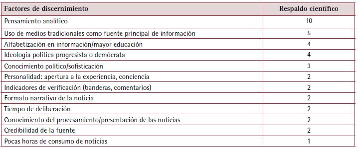 Con cuatro trabajos de respaldo, se encuentra que un elevado nivel educativo o altos niveles de alfabetización informativa se relacionan positivamente con la capacidad de discernir correctamente la falsedad de las noticias (por ejemplo, Jones-Jang et al., 2019). Como variables psicopolíticas, destacan la influencia del conocimiento y sofisticación políticos (por ejemplo, Bowyer & Kahne, 2019), así como posturas ideológicas de izquierda o alineadas al progresismo (Halpern et al., 2019). Además, ciertos rasgos de la personalidad, como mayor apertura a la experiencia, favorecen el discernimiento (Calvillo et al., 2021).