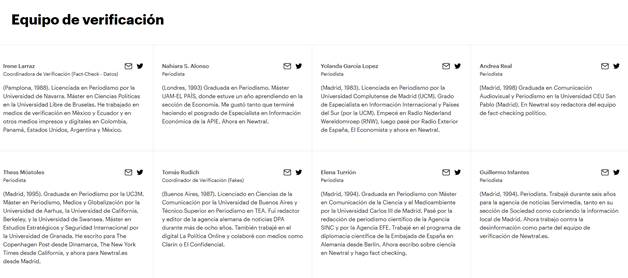 Uno de los requisitos que nosotros aplicamos y que exige el IFCN es que publiquemos en todos los artículos quién es el que firma el artículo, salvo que sea una noticia de la empresa, y que a su vez se publique su biografía para que haya garantías de que no forma parte de ningún partido, organización o empresa privada. De hecho, hay dos apartados: hay un apartado en el que se puede ver al equipo entero y hay otro apartado en que se puede ver al equipo que se dedica a la verificación más concreta.
