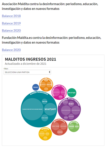 Otra de las diferencias que se detectaron fue la transparencia respecto a la financiación. Aunque ambas plataformas cuentan con un apartado específico que detalla la metodología de financiación del proyecto, mientras que Newtral muestra una descripción más superficial de sus cuentas, Maldita.es ofrece de forma detallada su balance de cuentas anual, desglosado y especificando las cantidades de ingresos y gastos que gestiona la plataforma en su parte de asociación. Además, cuenta con una herramienta interactiva titulada "Malditos ingresos" que permite a los usuarios desglosar los beneficios de la plataforma en su faceta de fundación, en función de su tipología: servicios, concursos públicos, premios o contribución económica de usuarios.