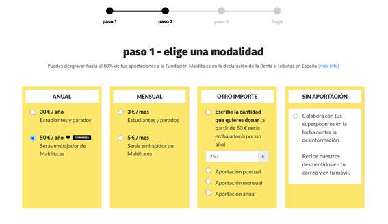 En el sentido contrario, el entrevistado B indicó que la experiencia de Maldita.es con la microfinanciación resultó muy positiva en lo referente a la fidelización de usuarios, que apostaron por aportar recursos económicos y además mostraron interés en participar de forma activa en el proyecto. Esto llevó a desarrollar un nuevo modelo de socios basado no solo en el aporte de una cantidad económica, sino también de conocimiento en la "lucha contra la desinformación".