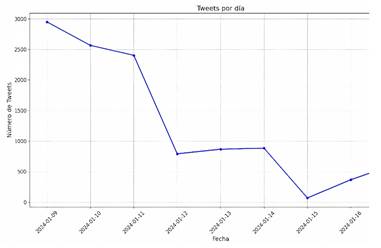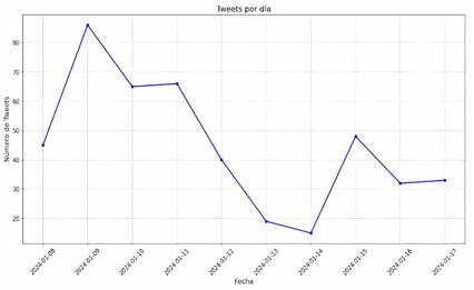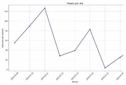 La Figura 3 muestra los trinos diarios de los medios de comunicación. El 9 de enero de 2024 se registraron 120 trinos, que bajaron a 50 el 10 de enero, subieron a 100 el 11 y cayeron a 40 el 12 de enero. Luego, fueron fluctuantes: 70 trinos el 14 de enero, 20 el 16 y 30 el 17. Este patrón refleja una actividad variable y una cobertura continua en las plataformas digitales.