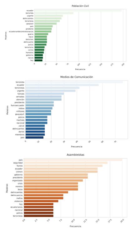 Estos nuevos hashtags complementaron la expresión de búsqueda #EcuadorBajoAtaque OR #EcuadorExigeSeguridad OR #EcuadorBajoAtaqueTerrorista OR #EcuadorEnGuerra, recopilando 11.498 trinos en total. Adicional a estos trinos se recolectó información de 97 cuentas de asambleístas2 durante el período comprendido entre el 9 y el 17 de enero de 2024, se obtuvo un total de 2.105 trinos.