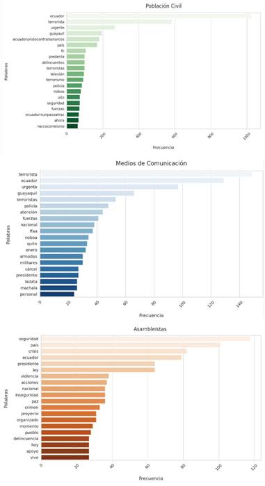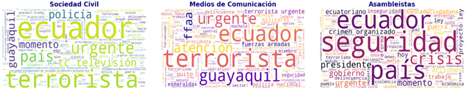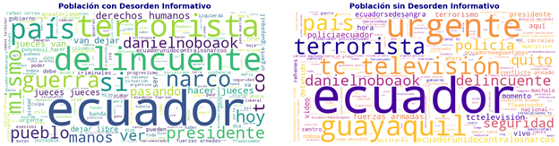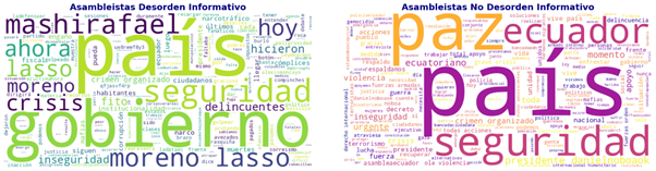 A continuación, se realizó un análisis en nubes de palabras basado en un modelado de tópicos aplicado a los trinos emitidos por medios de comunicación, población civil y asambleístas en la plataforma X, entre el 9 y el 17 de enero de 2024. El modelado de tópicos permitió identificar patrones temáticos y diferencias lingüísticas entre los trinos que contienen DI y aquellos que no, y mostró cómo estos últimos ofrecían más información y mayor claridad en los discursos narrativos de los actores. Los resultados revelan cómo cada grupo contribuye a la narrativa de la crisis, destacando términos que amplifican la percepción de inseguridad.