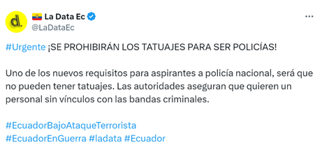 La Data Ec (@LaDataEc). (2024, enero 16). ¡Se prohibirán los tatuajes para ser policías! Uno de los nuevos requisitos para aspirantes a policía nacional, será que no pueden tener tatuajes. Las autoridades aseguran que quieren un personal sin vínculos con las bandas criminales (Posteo). X https://twitter.com/LaDataEc/status/1612468000000000000Links ]