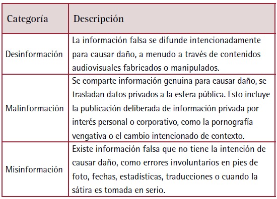 Este trabajo se enfoca en las categorías de desinformación, malinformación y misinformación (Tabla 1).