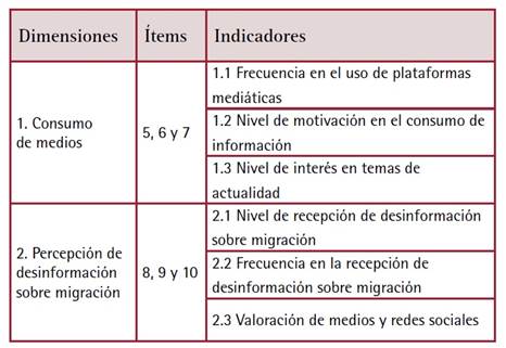 El instrumento cuantitativo aborda la dimensión del consumo de medios a través de los siguientes indicadores: frecuencia en el uso de plataformas, nivel de motivación en el consumo de información y nivel de interés en temas de actualidad. Posteriormente, explora la dimensión de percepción de desinformación sobre migración mediante los indicadores: nivel de recepción de desinformación, frecuencia en la recepción de desinformación según plataformas, y valoración de medios y redes sociales como canales de información.