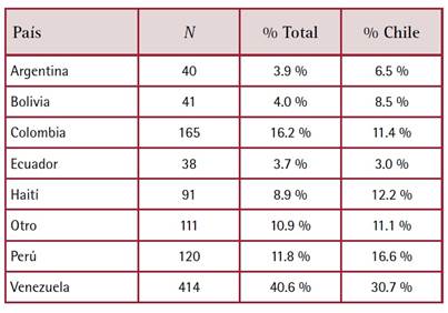 La primera está conformada por 1,020 personas migrantes mayores de 18 años, representativa para 1,482,390 personas extranjeras en Chile (INE & SNM, 2022), con un 98 % de confianza y un 4 % de error. Se trata de un muestreo por cuotas conformado por 54.5 % mujeres y 45.5 % hombres en la Región Metropolitana y otras regiones, cuya distribución por país de procedencia es: Argentina 3.9 %, Bolivia 4 %, Colombia 16.2 %, Ecuador 3.7 %, Haití 8.9 %, Perú 11.8 %, Venezuela 40.6 % y otros países 10 %. En la Tabla 2 se observa la proporción de la muestra según la cantidad real en Chile.